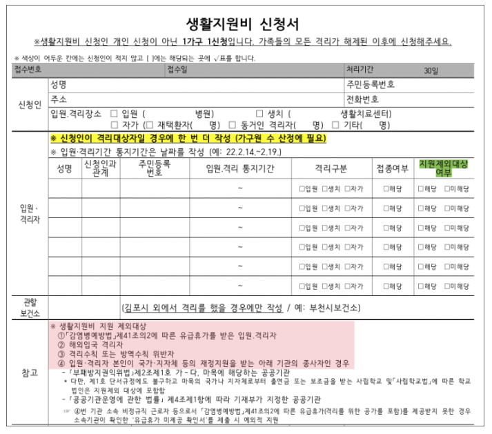 - (신청서류) 생활지원비 신청서, 격리대상자 본인 통장(사본), 신분증, 예외 신청사유 증빙서류 등